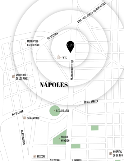 Alure Insurgentes se erige como una torre icónica sobre Insurgentes sur en la colonia Nápoles, a un costado del World Trade Center, que por sus centros de negocios, oferta cultural y gastronómica, así como su conectividad y servicios, es considerada una de las zonas más importantes de la Ciudad de México.